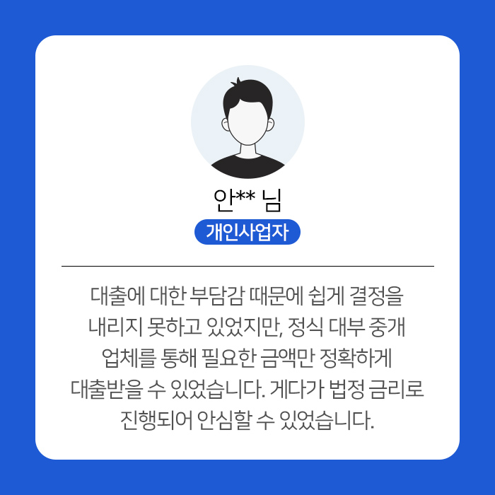기대출이나 연체와 상관없이 법정 금리로,매출만 확인되면 전국 어디서든안전금리로 대출 가능합니다.
